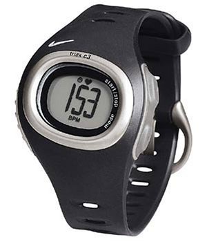Nike Unisex Triax C3 Heart Rate Monitor Watch Perfect for beginning runners and working out at the gym, the Nike Triax C3 keeps track of your training time as well as your fitness level with the included heart rate monitor chest strap. It features basic chronograph timing features (with one alarm and 12/24-hour time) and accurate heart rate measurement. The watch case and co-molded polyurethane strap form a unique S-shaped design that curves comfortably around your wrist for an improved fit and quicker reading of the time. Other features include Nike Electrolite one-touch backlighting, water resistance to 50 meters (165 feet), and a battery hatch on watch and chest strap for easy battery replacement. Read more